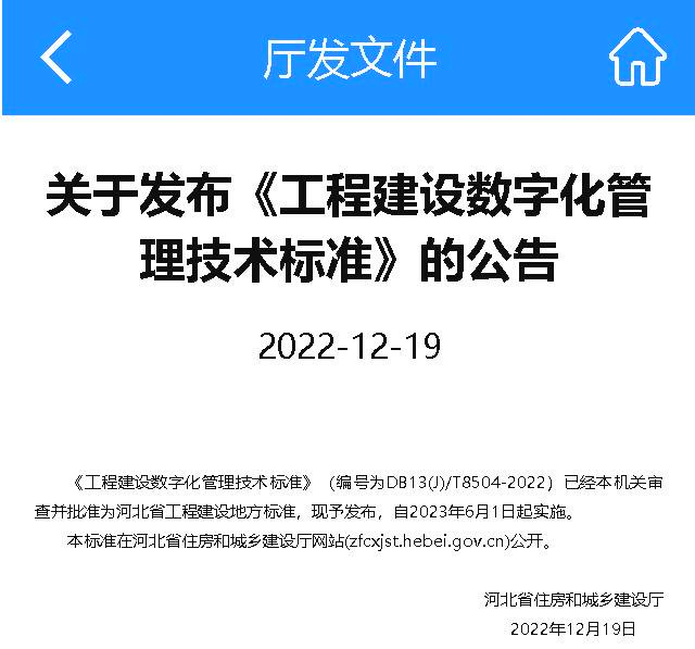 2022年12月19日,由河北省建筑科學研究院有限公司、河北省住房和城鄉(xiāng)建設廳信息宣傳與檔案中心和北方工程設計研究院有限公司共同主編的《工程建設數字化管理技術標準》(編號為DB13(J)/T8504-2022)已經河北省住房和城鄉(xiāng)建設廳審查并批準為河北省工程建設地方標準,自2023年6月1日起實施。