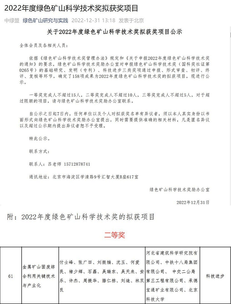 我公司申報的“金屬礦山固廢綜合利用關鍵技術與產(chǎn)業(yè)化”項目依據(jù)《綠色礦山科學技術獎管理辦法》規(guī)定和《關于申報2022年度綠色礦山科學技術獎的通知》的要求,經(jīng)綠色礦山科學技術獎勵辦公室對申報綠色礦山科學技術獎(國科獎社證第0265號)的基礎研究、發(fā)明(專利)、科技進步三類獎項通過申報、形式審查、初評、終評、復核等環(huán)節(jié),確定我公司申報的“金屬礦山固廢綜合利用關鍵技術與產(chǎn)業(yè)化”榮獲2022年度綠色礦山科學技術獎二等獎。