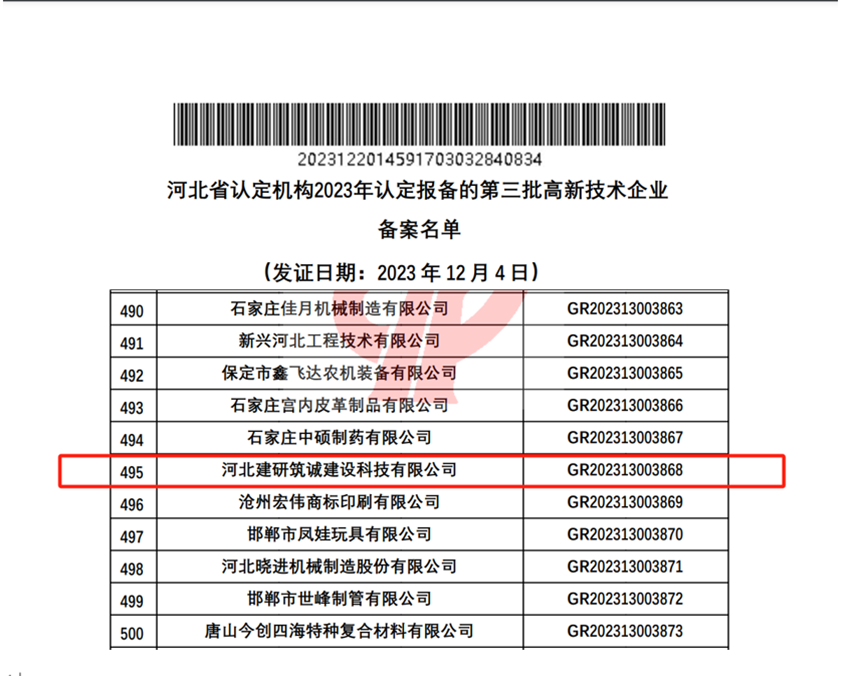 2023年12月20日,全國(guó)高新技術(shù)企業(yè)認(rèn)定管理工作領(lǐng)導(dǎo)小組辦公室公示了河北省認(rèn)定機(jī)構(gòu)2023年認(rèn)定報(bào)備的第三批高新技術(shù)企業(yè)備案名單,河北建研筑誠(chéng)建設(shè)科技有限公司順利通過(guò)了國(guó)家高新技術(shù)企業(yè)認(rèn)定(證書編號(hào)GR202313003868),標(biāo)志著公司在科技創(chuàng)新的道路上又邁出了堅(jiān)實(shí)的一步。