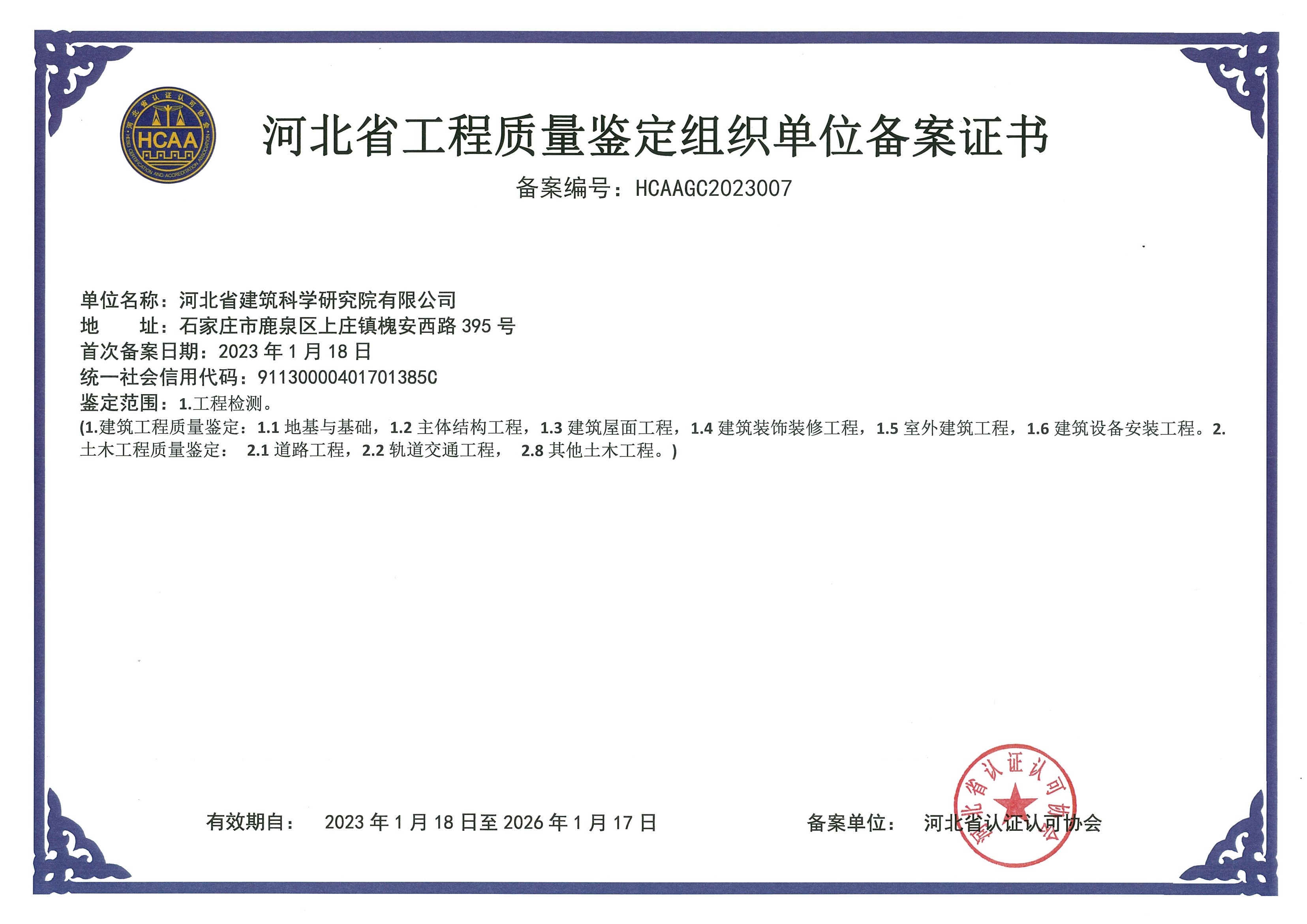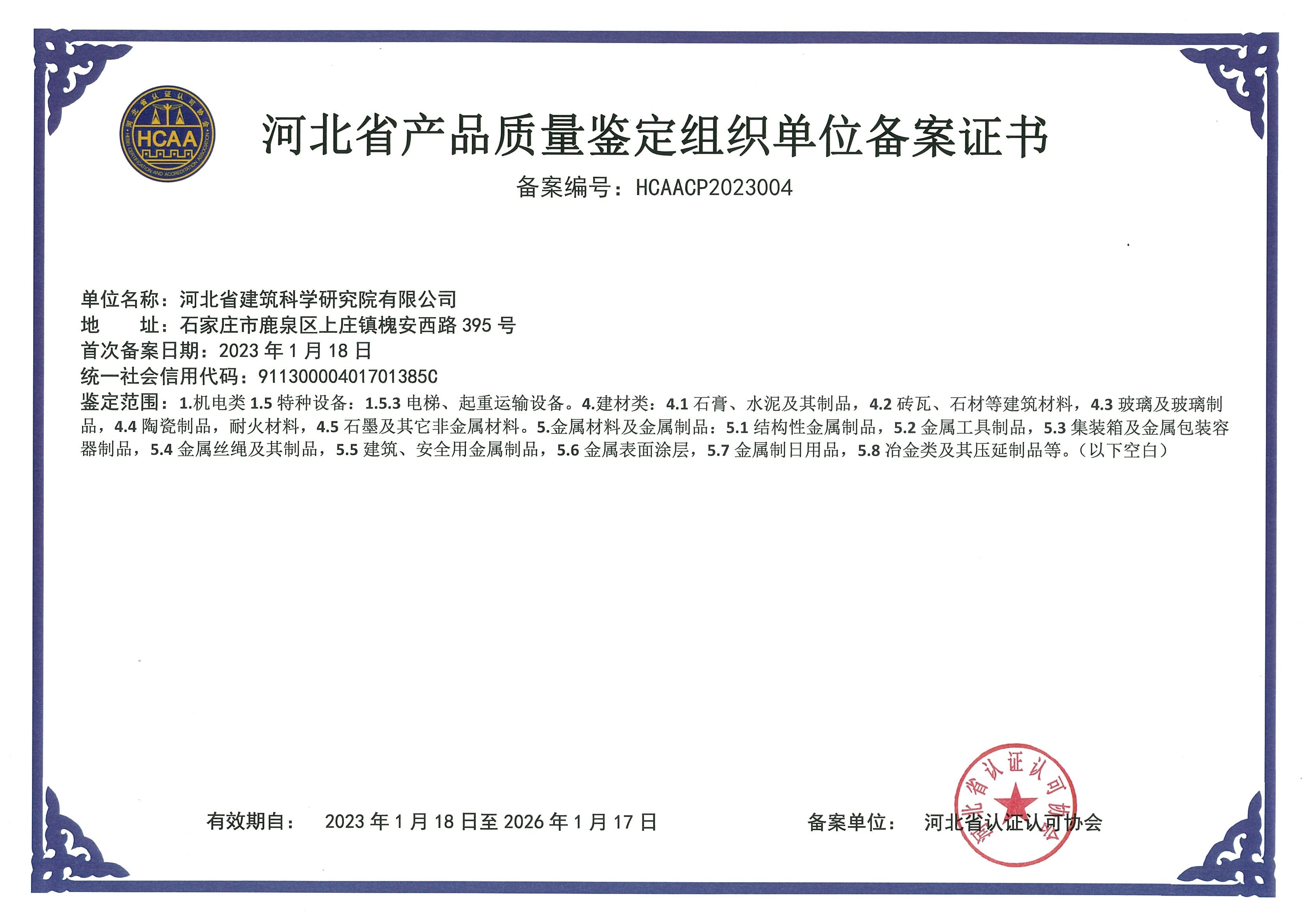 河北省建筑科學研究院有限公司產(chǎn)品質量鑒定組織單位備案證書2