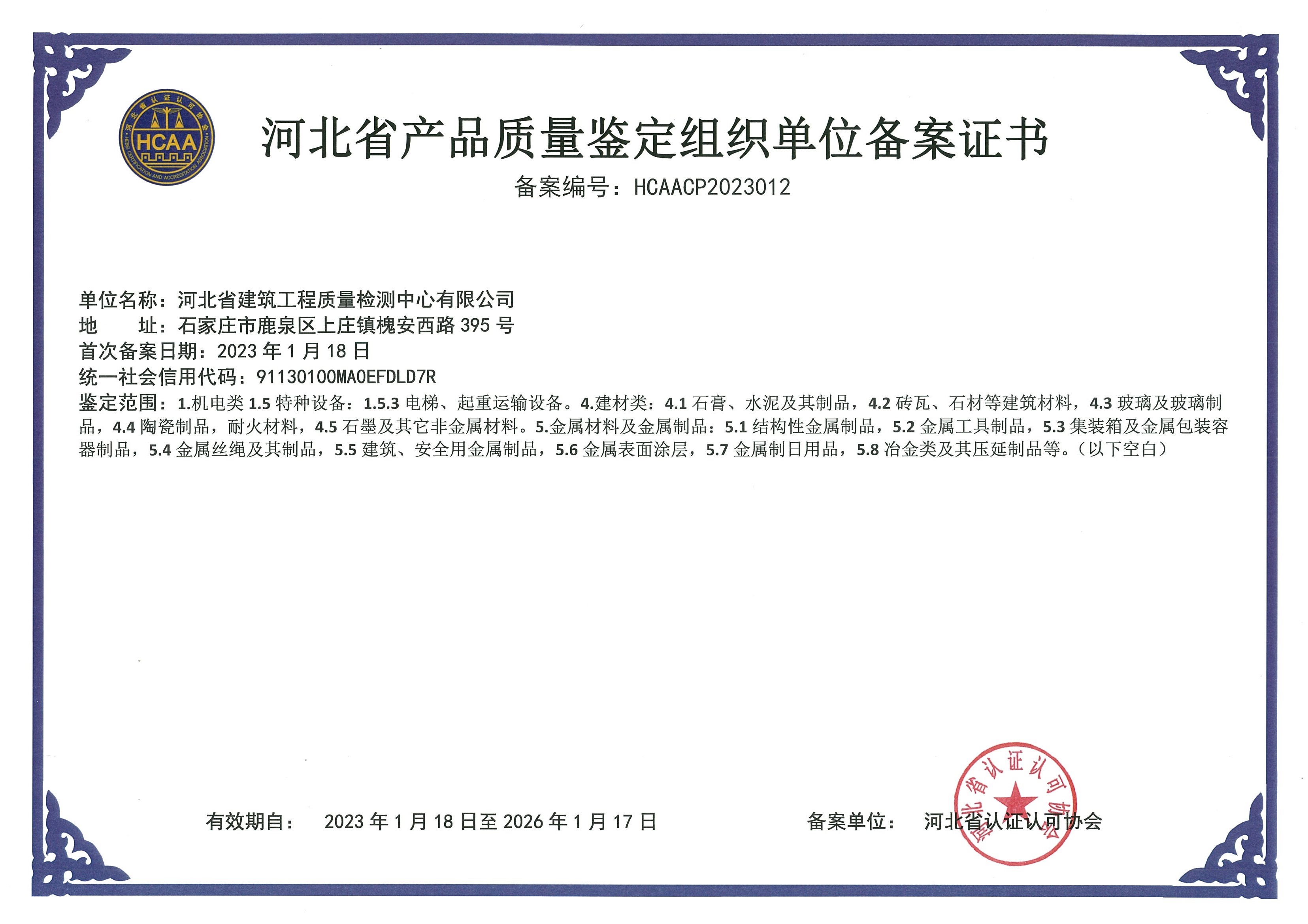 ]河北省建筑工程質量檢測中心產(chǎn)品質量鑒定組織單位備案證書2