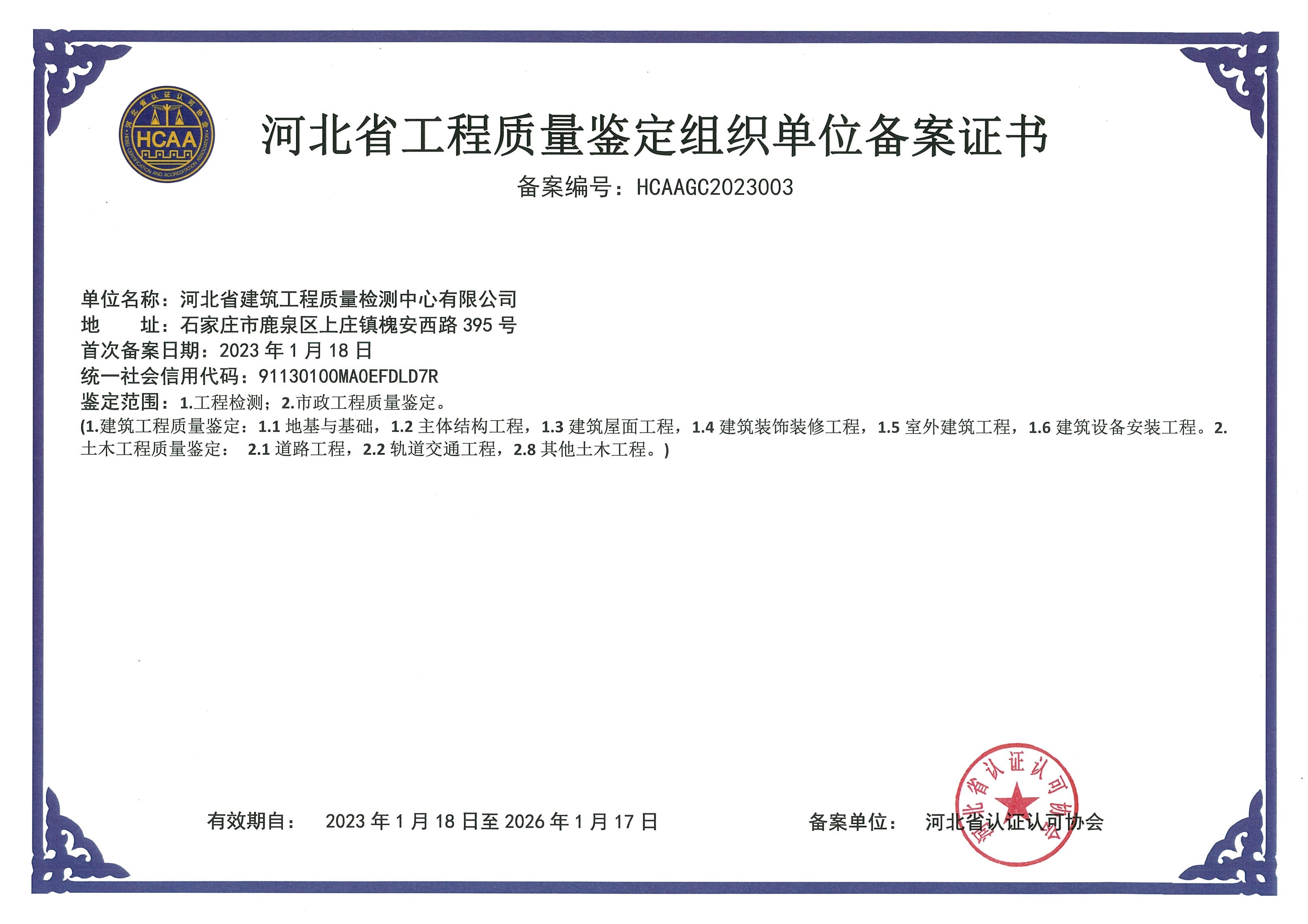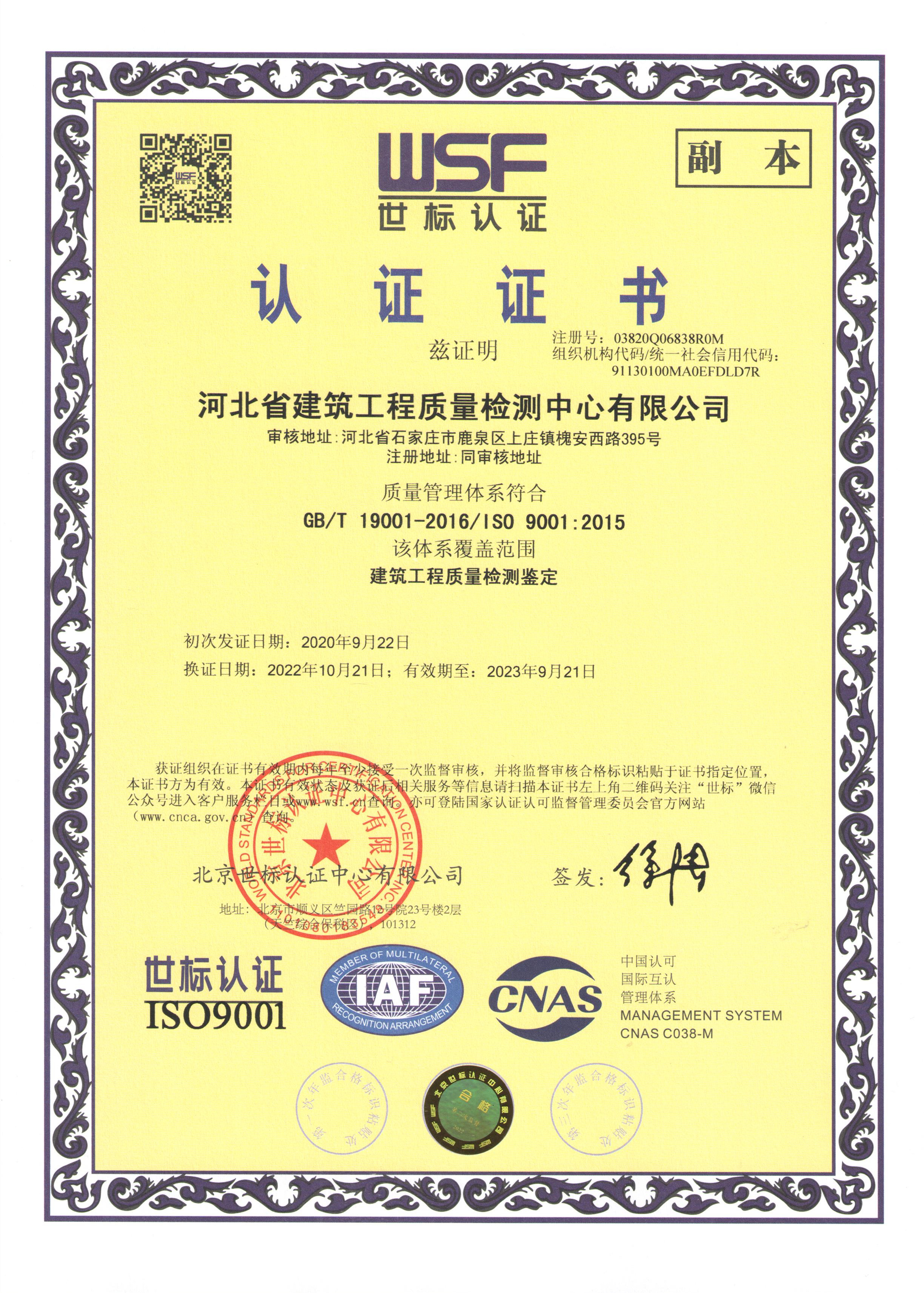 河北省建筑工程質量檢測中心認證證書2